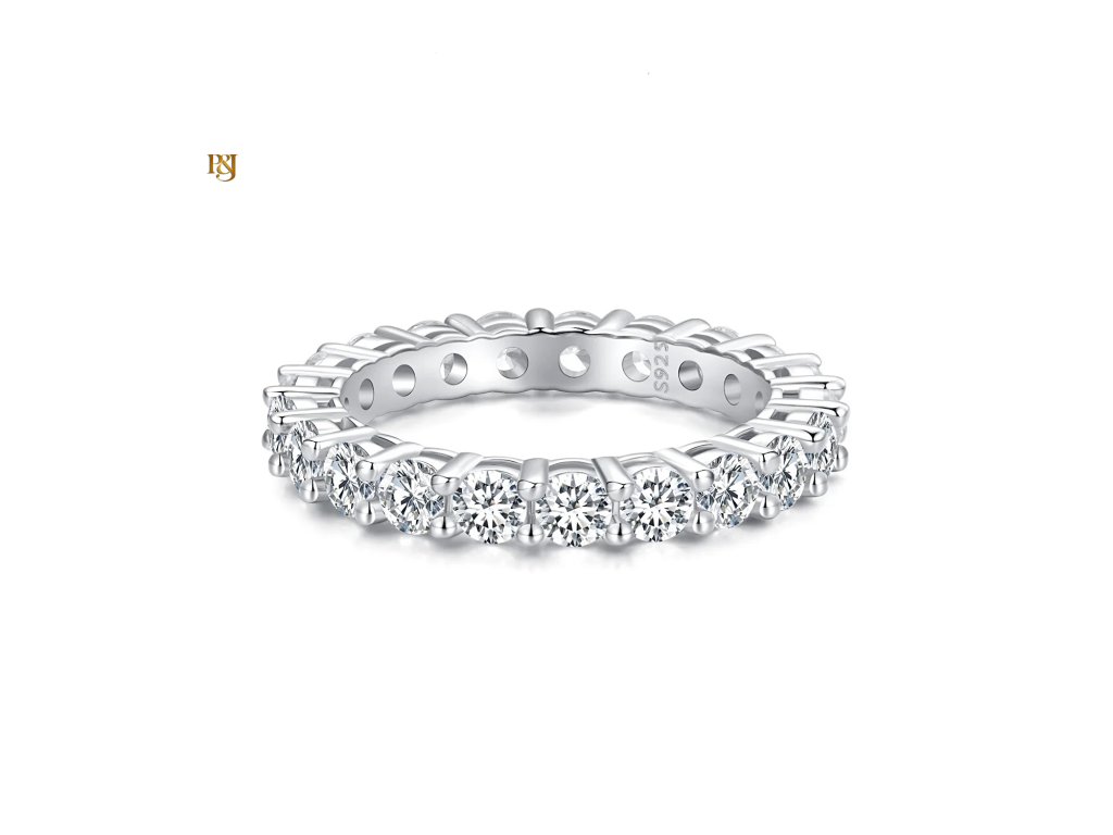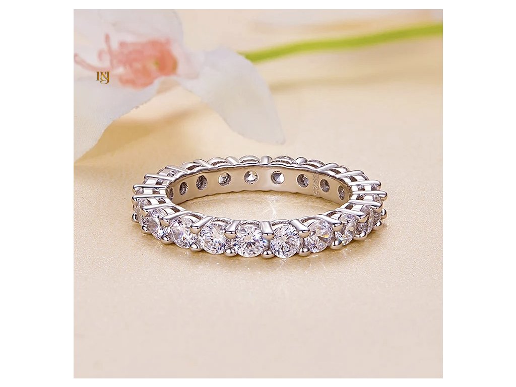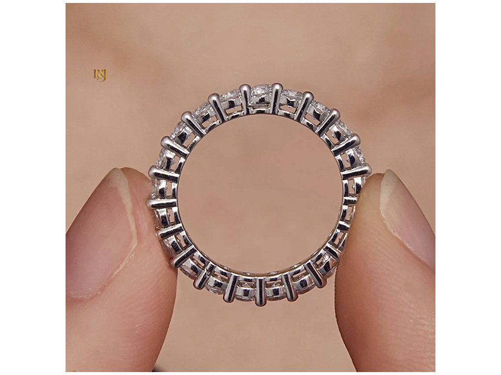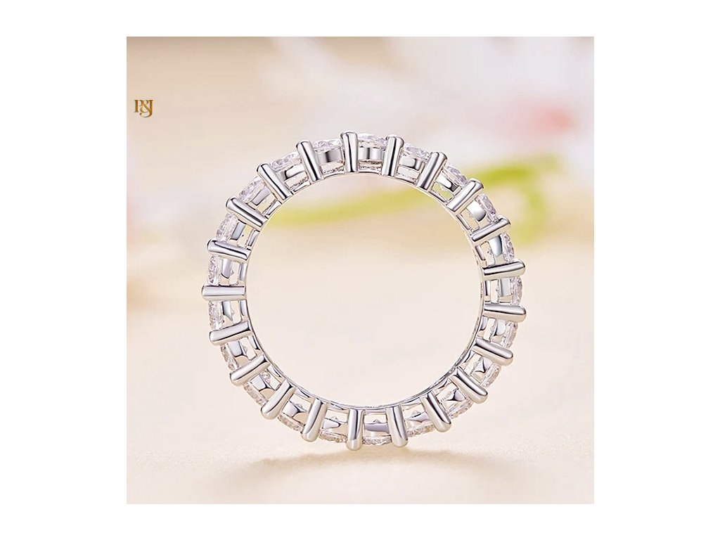 Celý prsten je osazen krásnými moissanity, z nichž každý má karátovou váhu 0,1 ct. Moissanit je známý pro svou neobyčejnou jasnost a ohnivé jiskření, které dokáže okouzlit každého. S čistotou VVS1 a certifikátem GRA se můžete spolehnout na to, že budete nosit šperk nejvyšší kvality.