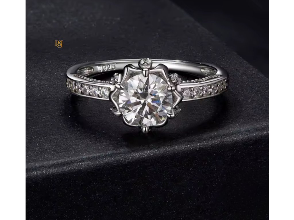 • Prsten s moissanitem zasazeným v precizní korunce a drobnými kamínky po obvodu.