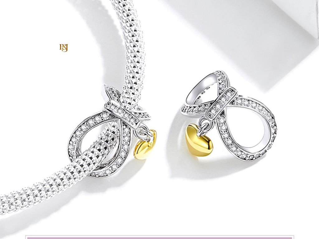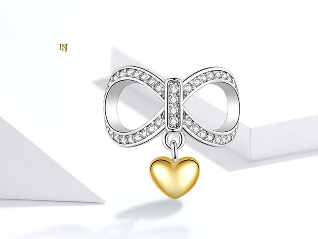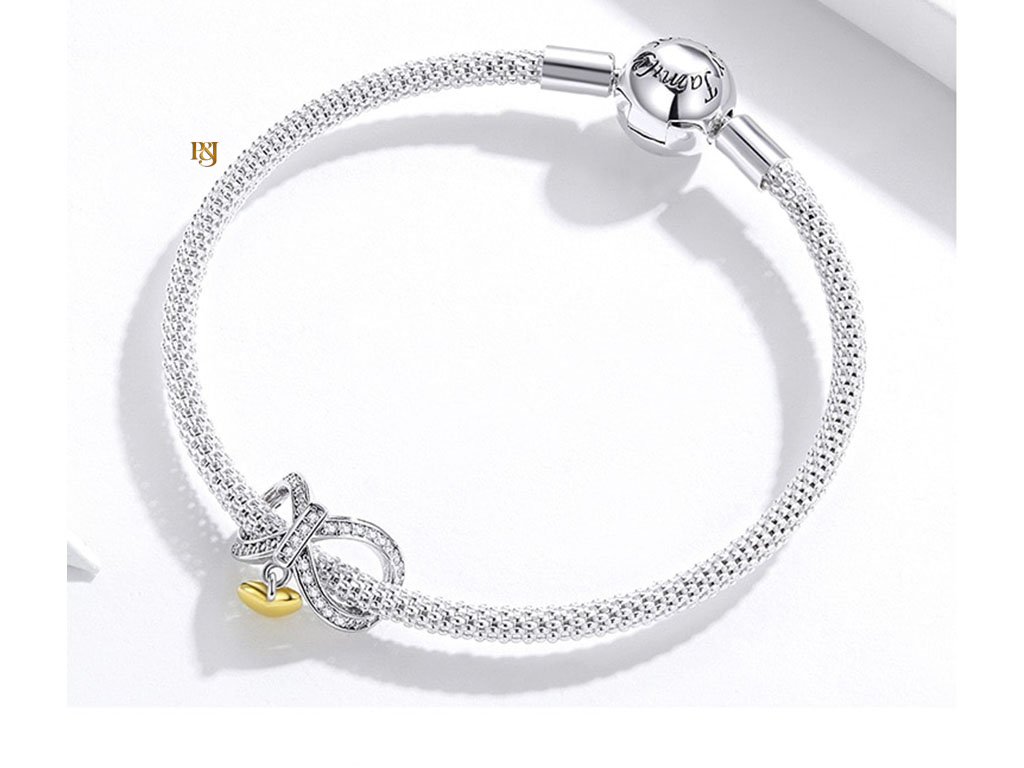 • Přívěšek tvoří dvě části: velká ležatá osmička, symbol nekonečna nebo věčnosti, s mírně zahnutým tvarem, vyrobený celý ze stříbra a zdobený drobnými čirými zirkony po celém obvodu, které dodávají přívěsku lesk a výjimečný vzhled.